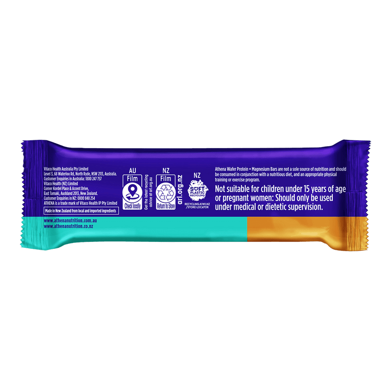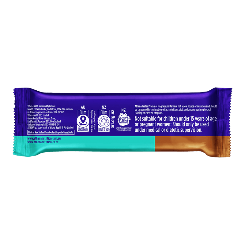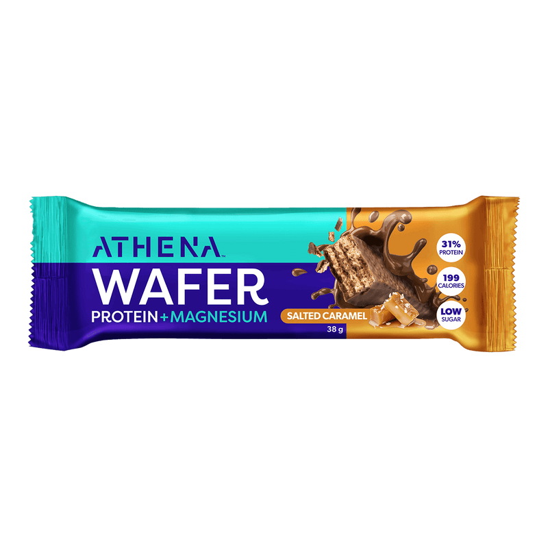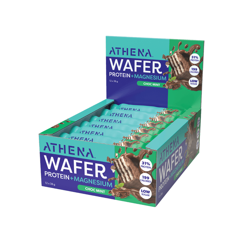Indulge in the delicious taste of Athena Wafer Protein + Magnesium bars, packed with 31% protein and 25% RDI magnesium.