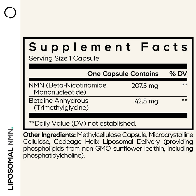 Boost your energy and vitality with Codeage Liposomal NMN supplement, featuring stabilized nicotinamide mononucleotide (NMN) in powder-filled capsules, complemented with betaine anhydrous (TMG).