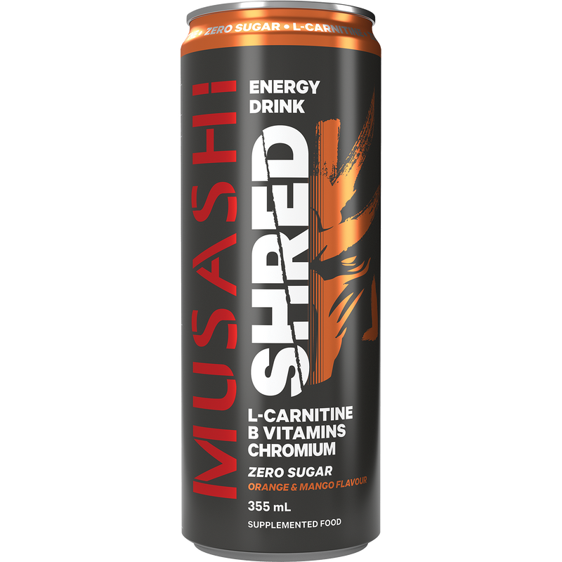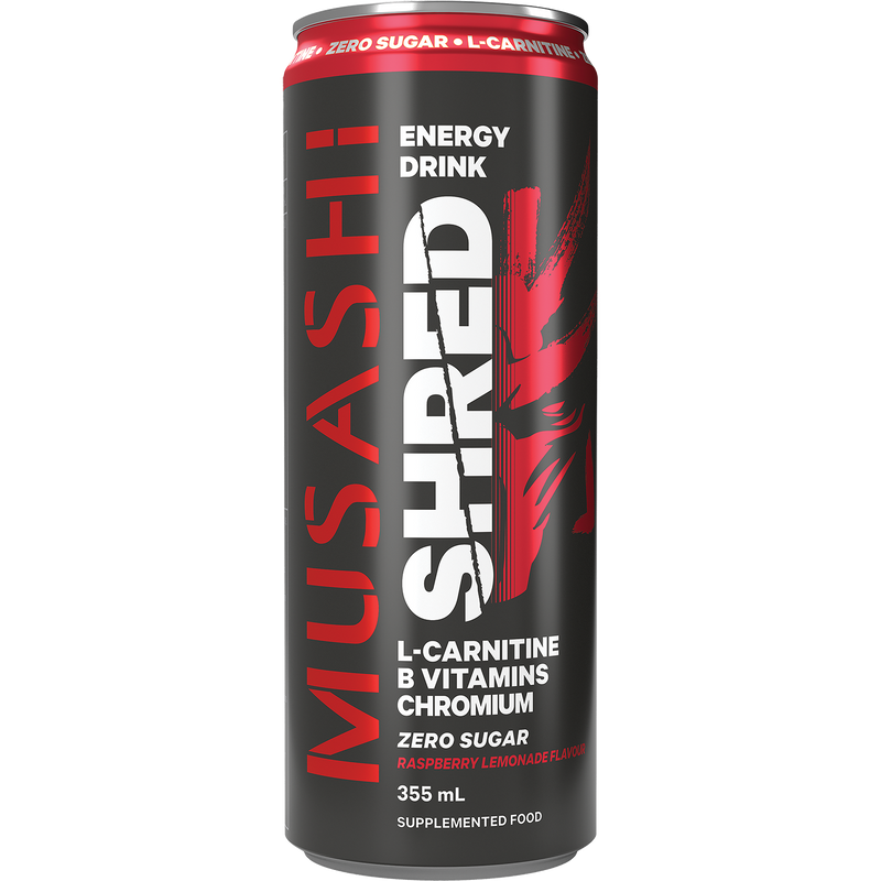 Fuel your shred phase with clean, targeted energy. Musashi Shred Energy is a zero-sugar, low-calorie drink designed to support fat metabolism while delivering the boost you need to power through your day or your next training session. With a blend of L-Carnitine, Chromium, and Green Tea Extract, it’s made for those chasing lean goals. Added B Vitamins (B3, B5, B6 & B12) help fight fatigue and support sustained energy—so you can keep showing up strong. Shred-Supporting Ingredients – L-Carnitine, Chromium, and Green Tea to support body composition goals. B-Vitamins to Fight Fatigue – Helps reduce tiredness and support energy metabolism. Zero Sugar, Low Calories – No crash, no compromise—just clean fuel. Convenient 12-Pack – Stock up and stay ready with a fridge-friendly box of 355ml cans.