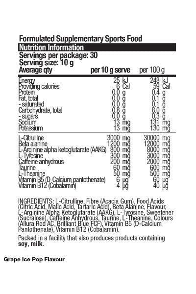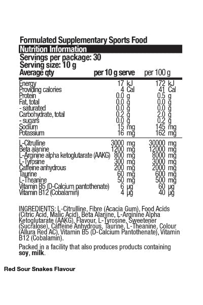 | Key Ingredients | L-Citrulline, Beta-Alanine, L-Arginine, L-Tyrosine, Caffeine Anhydrous |