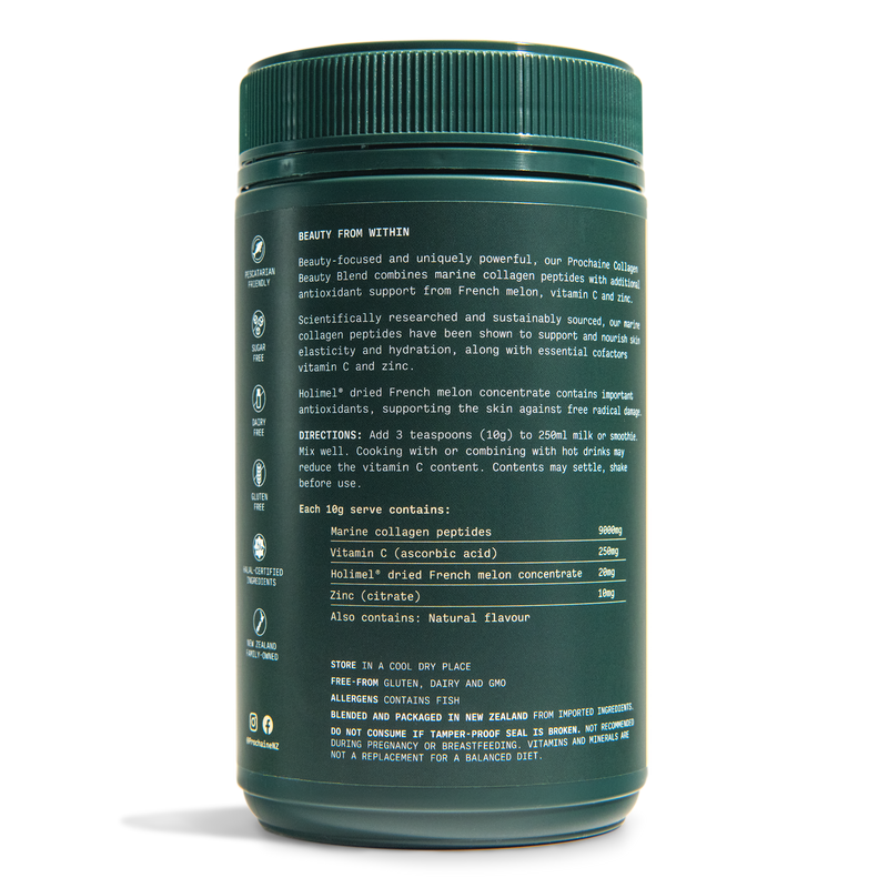 Indulge in our delicious vanilla flavoured Collagen Beauty Blend, the perfect addition to your daily smoothies and yoghurt. This amazing blend is packed with high dose marine collagen peptides and a powerful antioxidant mix featuring vitamin C, zinc, and Holimel French melon concentrate.