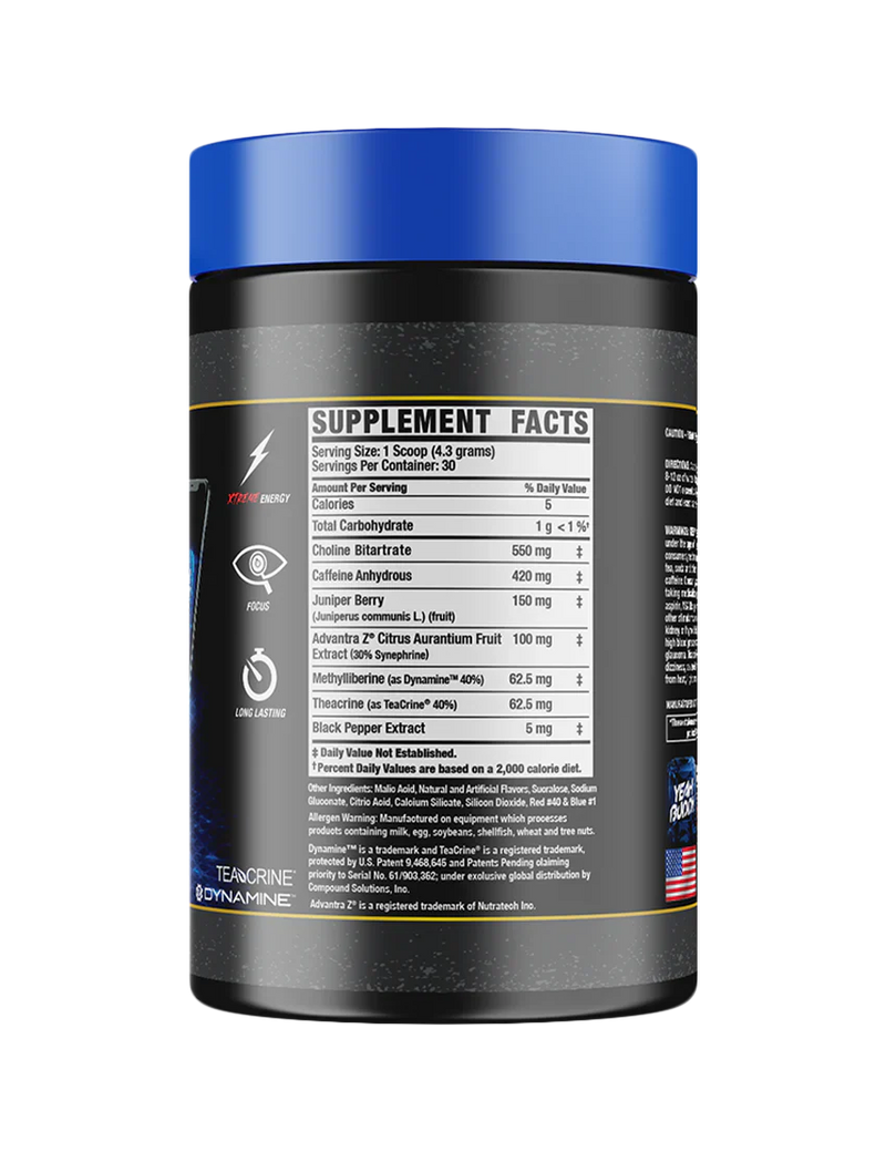 This high-powered formula is designed for next-level energy, laser focus, and peak performance. It's reinforced with Dynamine, one of the latest breakthroughs in energy and focus enhancement. With a potent blend of 420mg Caffeine Anhydrous, 150mg Juniper Berry, 62.5mg Dynamine, 62.5mg TeaCrine, and Black Pepper Extract, you'll enjoy a smooth, clean boost of energy, enhanced mental clarity, and lasting endurance without the dreaded crash.
